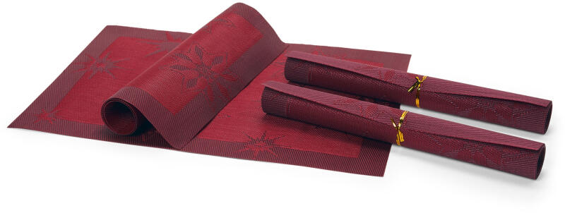 4 db tányéralátét, csillagos, piros, 45 x 33 cm Szín: 4x piros Anyag: 100% poliészter Bevonat: 100% polietilén Méretek: Egyenként kb. 33 x 45 cm Használati tudnivalók: Nedves ruhával letörölhető Karácsonyi mintávalKiváló minőségű, műanyagból szőtt, színben harmonizáló mintázattalMinden asztalon jól mutatnakKönnyen tisztíthatók és lemoshatókSokoldalúan használhatókEgyenként kb. 33 x 45 cm