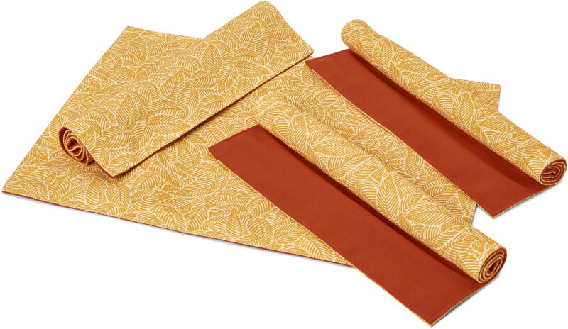 4 kétoldalas tányéralátét Szín: 1 levélmintás sárga oldal, 1 terrakotta oldal Anyag: 100% poliészter Méretek: Egyenként kb. 48 x 33 cm Sokoldalúan használhatók – egy egyszínű oldal és egy nyomott mintás oldalKétrétegű kidolgozásMinden asztalon jól mutatnakKülönösen könnyen tisztíthatókEgyenként kb. 33 x 48 cm