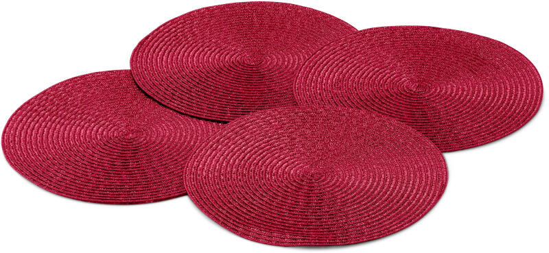 4 tányéralátét, kerek, piros, 35cm Szín: Sötétpiros Anyag: 90% poliészter, 10% fémbevonatú poliészter Méretek: Ø egyenként: kb. 35 cm Védik az asztal felületétStrapabíró műanyagszövet fémbevonatú fonallalMutatós és ünnepiÁtmérőjük egyenként: kb. 35 cmNedves ruhával letörölhető